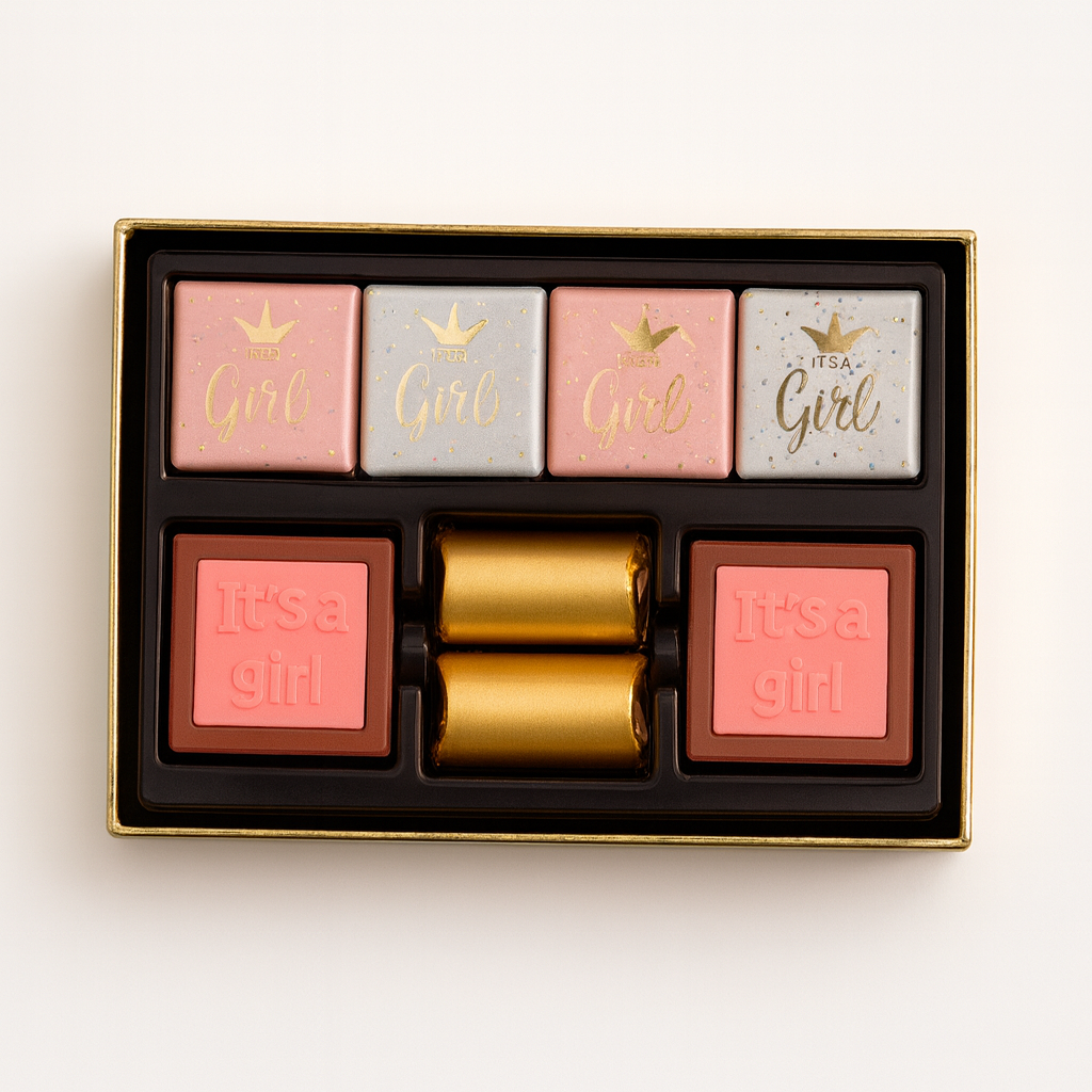 Each chocolate inside the It’s a Girl Box is wrapped in delicate, occasion-themed foil that enhances the charm of this premium newborn gift. The selection includes 16 indulgent pieces crafted in biscuit, nuts, and biscuit-with-caramel flavors—perfect for sharing with family and friends during baby showers, hospital visits, or gifting directly to new parents.