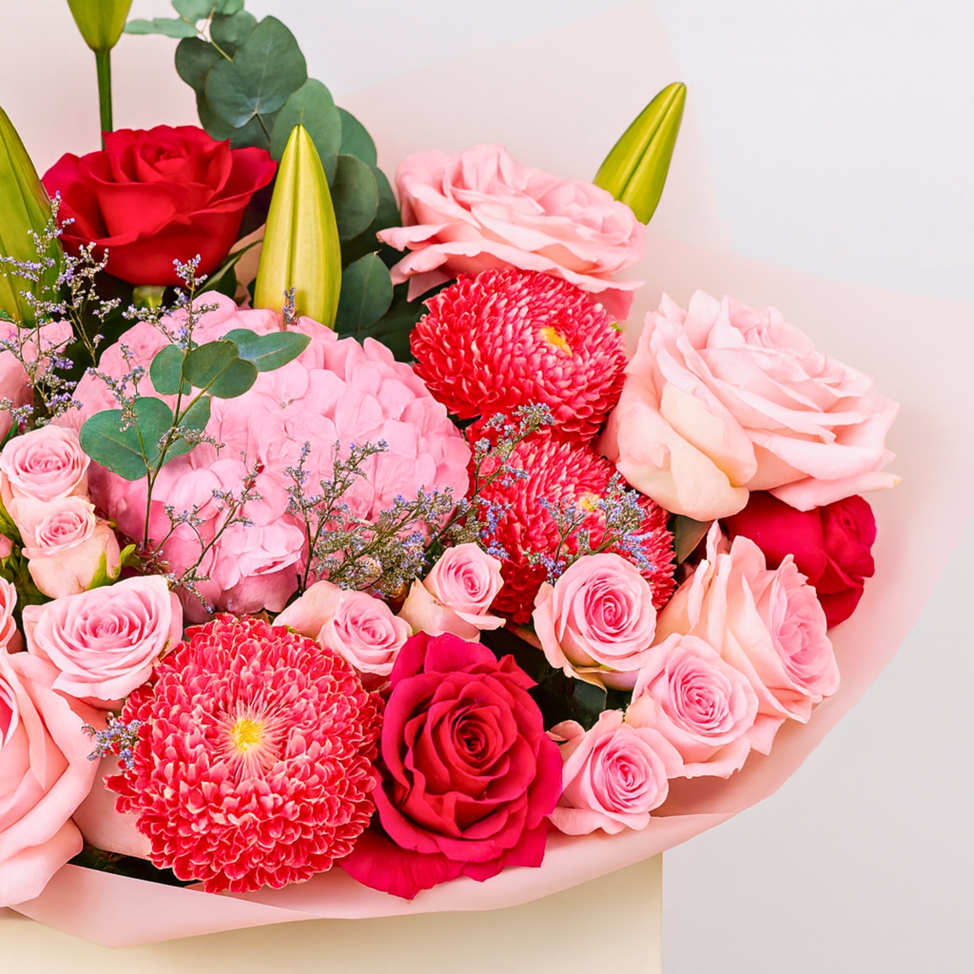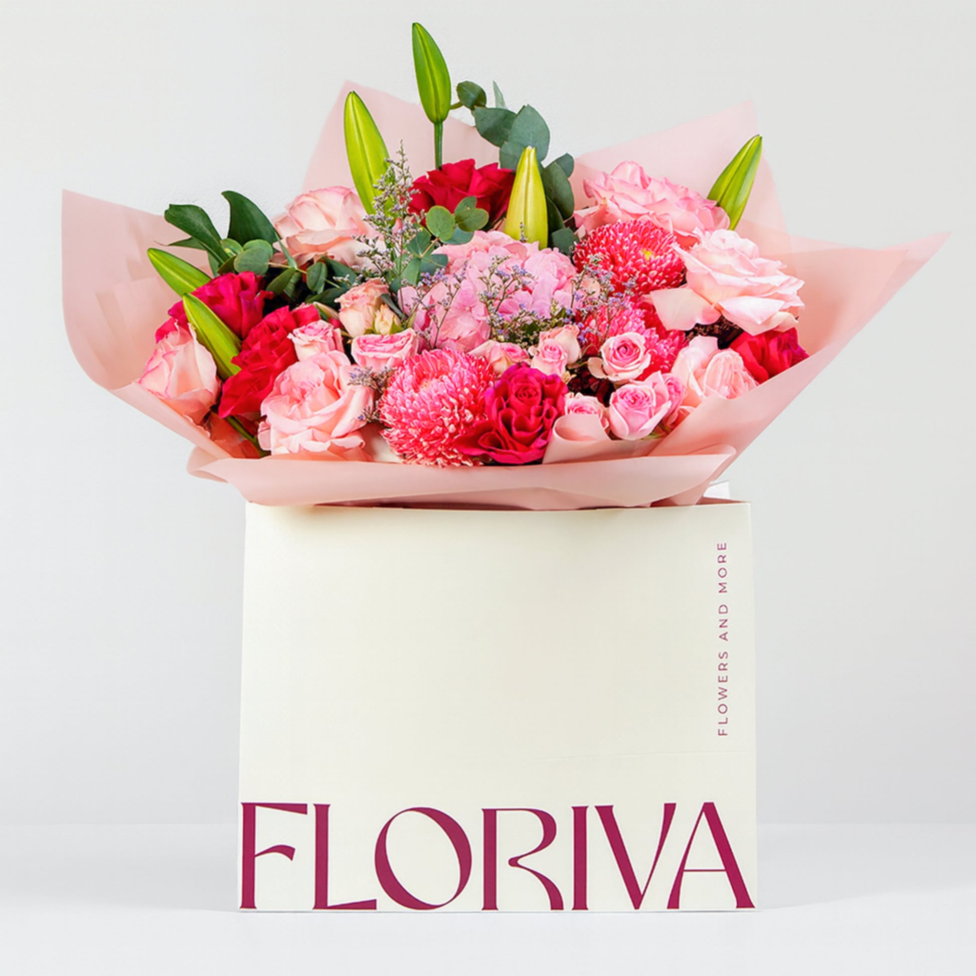 Indulge in the romantic elegance of Berry Blush, Floriva’s luxurious floral creation designed to captivate with its rich blend of pink and red blooms. This premium arrangement features roses, hydrangeas, chrysanthemums, spray roses, and lush accents, all thoughtfully composed to showcase the vibrant beauty that defines Berry Blush. Wrapped in soft pastel tones and presented in Floriva’s signature box, Berry Blush delivers a stunning mix of texture, color, and depth—perfect for celebrations, heartfelt gifts, and unforgettable moments. Floriva’s craftsmanship brings Berry Blush to life with exceptional freshness, balanced composition, and premium-quality flowers that make a lasting impression.