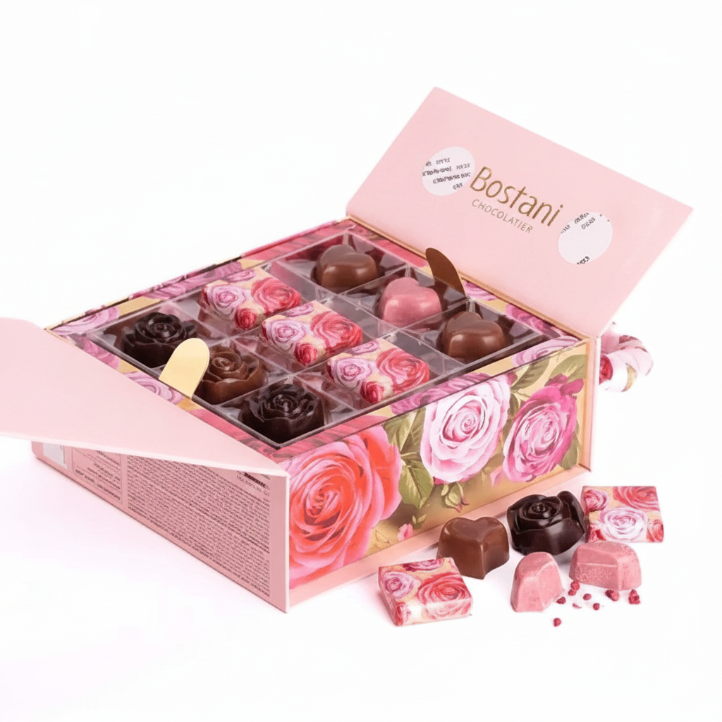 Present a truly impressive and heartfelt gift with the Floriva Big Rose Bag Chocolate Box, an exquisite confectionary masterpiece inspired by the timeless beauty of lush floral arrangements. This substantial and delightful box from Floriva contains 18 premium chocolates, carefully arranged in two luxurious layers, weighing 246 grams – a generous portion of pure, gourmet indulgence perfect for sharing or making a grand statement.