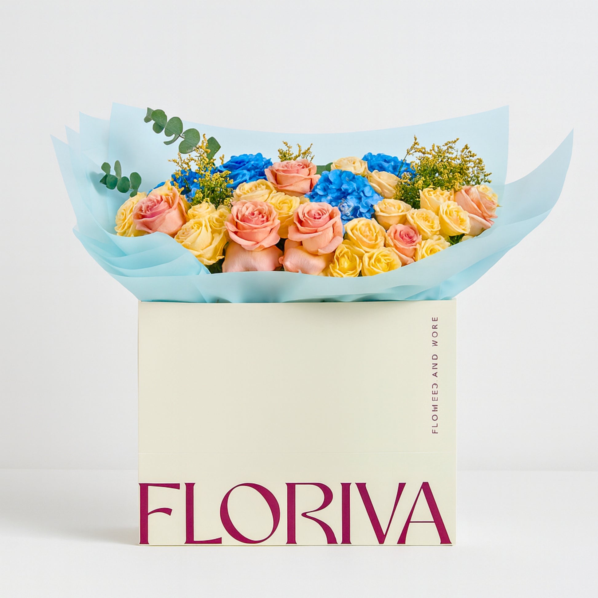 Embrace the refreshing beauty of the sea with Coastal Dream, Floriva’s elegant floral arrangement inspired by soft ocean hues and serene coastal charm. Featuring a luxurious blend of pastel roses paired with vibrant blue hydrangeas, Coastal Dream offers a soothing yet captivating color palette that brings tranquility and sophistication to any occasion. Presented in Floriva’s signature box and wrapped in delicate aqua-toned paper, Coastal Dream radiates freshness, elegance, and artistic harmony. Perfect for birthdays, celebrations, thoughtful gestures, or uplifting any space, Coastal Dream beautifully reflects Floriva’s commitment to premium floral craftsmanship and timeless design.