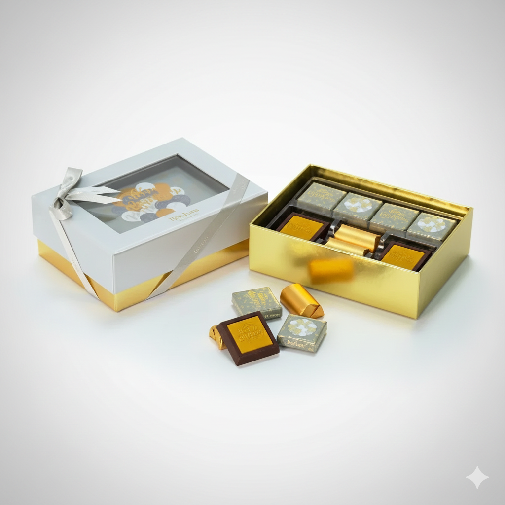 Each of the 16 premium chocolate pieces is carefully wrapped in a soft, festive balloon-patterned foil, adding to the celebratory feel. Indulge in an enticing assortment of biscuit, crunchy nuts, and rich biscuit with caramel flavors – a selection that promises to please every palate. The exceptional quality and thoughtful presentation are hallmarks of Floriva products, ensuring a memorable unboxing experience.