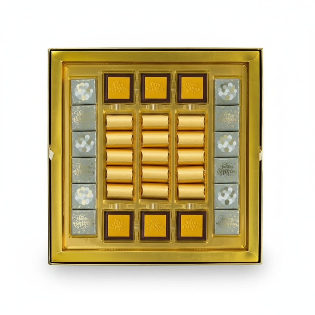 Make every birthday an unforgettable celebration with the magnificent Floriva Happy Birthday Box, the ultimate luxurious gift. This exceptional two-layer silver box, a premium offering from Floriva, weighs a generous 980g and is exquisitely wrapped with an elegant silver satin ribbon. The joyous phrase "Happy Birthday" is beautifully showcased on both the box and the delightful chocolates within, setting a grand and festive tone.