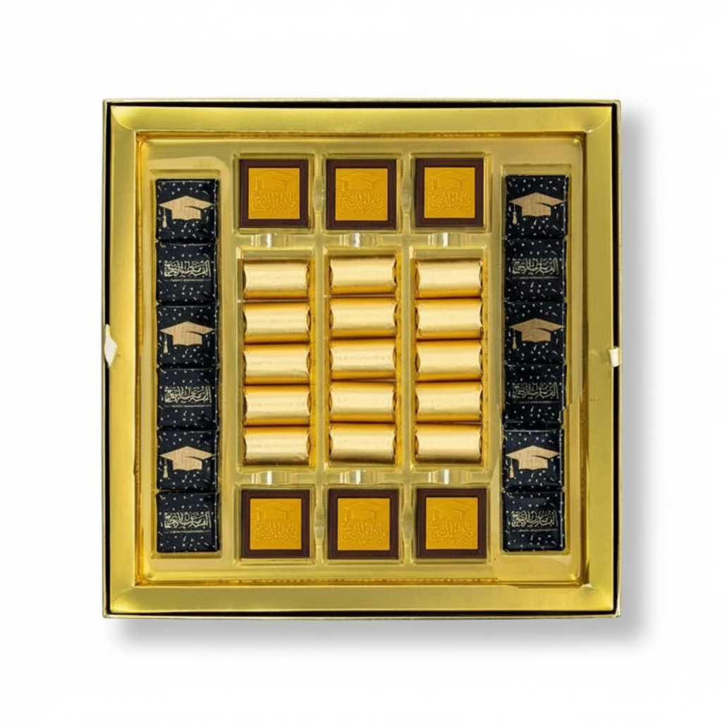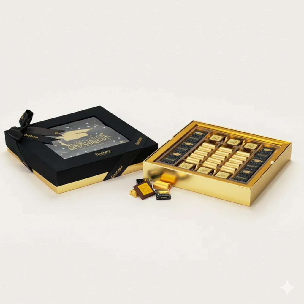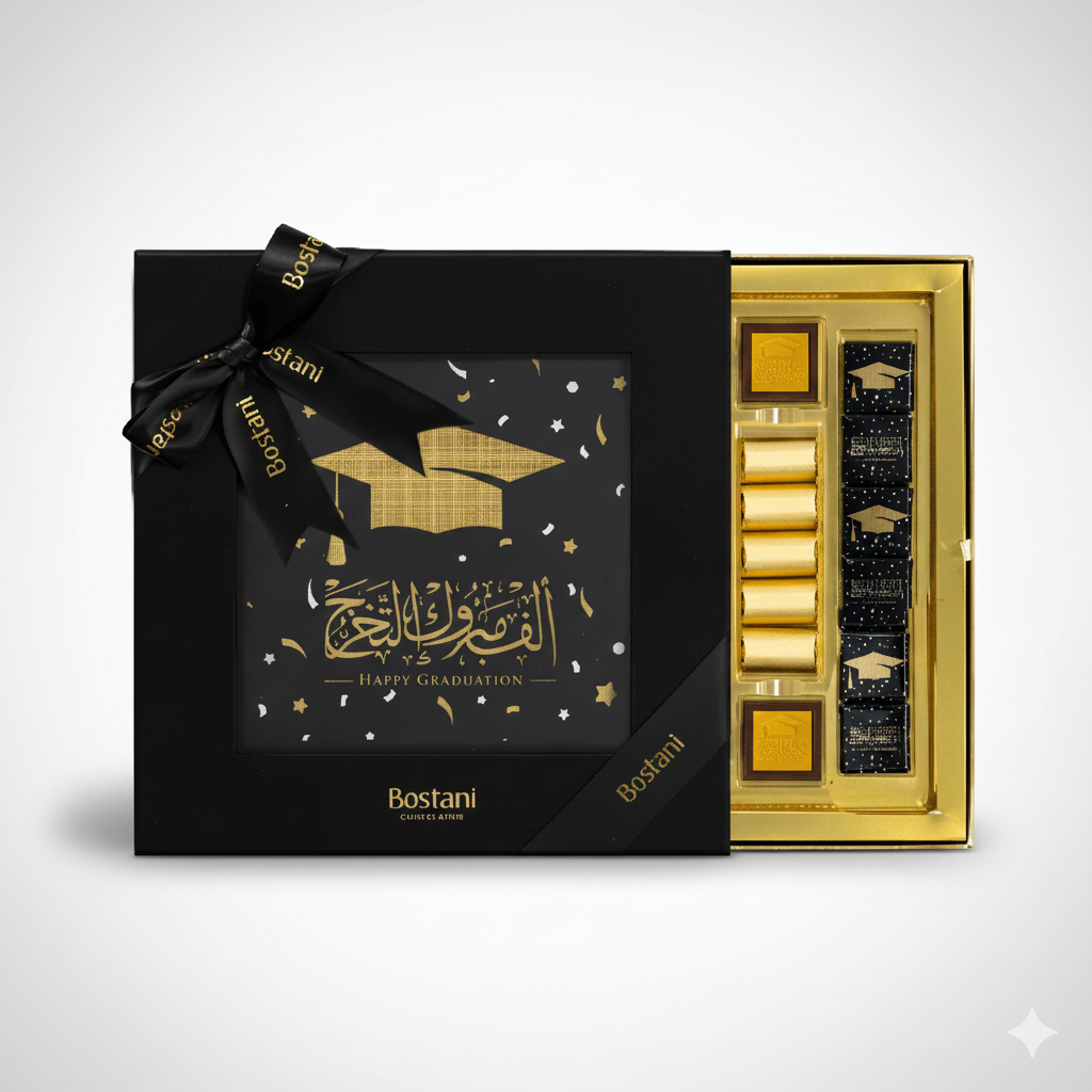 Commemorate a momentous achievement with the Floriva Happy Graduation Box, a truly deluxe and memorable gift. This exceptional two-layer black box, a premium offering from Floriva, weighs a generous 980g and is exquisitely wrapped with a sophisticated satin ribbon. The box wrapper proudly showcases the heartwarming phrase "Happy Graduation," beautifully accented with festive graduation cap and celebration illustrations—a motif elegantly continued on many of the chocolates within.