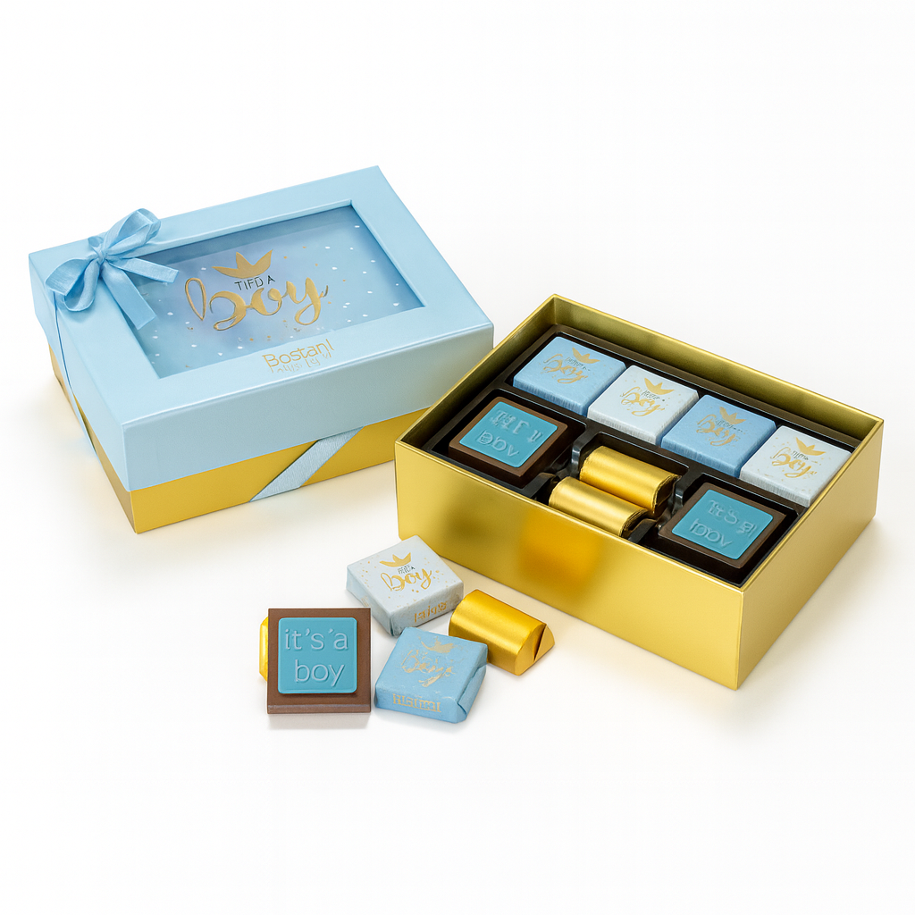 Celebrate the joy of welcoming a new baby boy with Floriva’s elegant It’s a Boy Box, a premium 16-piece chocolate collection crafted to impress. This luxurious two-layer blue gift box is beautifully wrapped with a satin ribbon and adorned with the “It’s a Boy” message on both the box and chocolates, making it the perfect gifting choice for newborn celebrations.